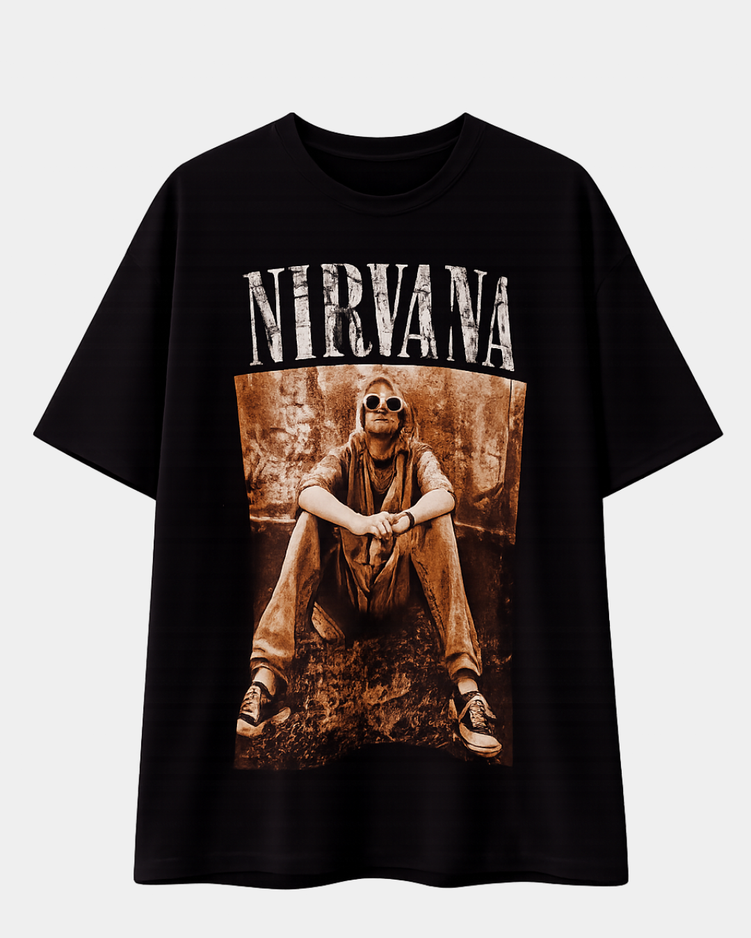 Channel effortless 90s grunge style with this Nirvana Vintage Oversized Graphic T-Shirt in classic black. Featuring a bold distressed “NIRVANA” logo and iconic sepia portrait print, this oversized tee delivers a relaxed streetwear fit with a timeless rock aesthetic.