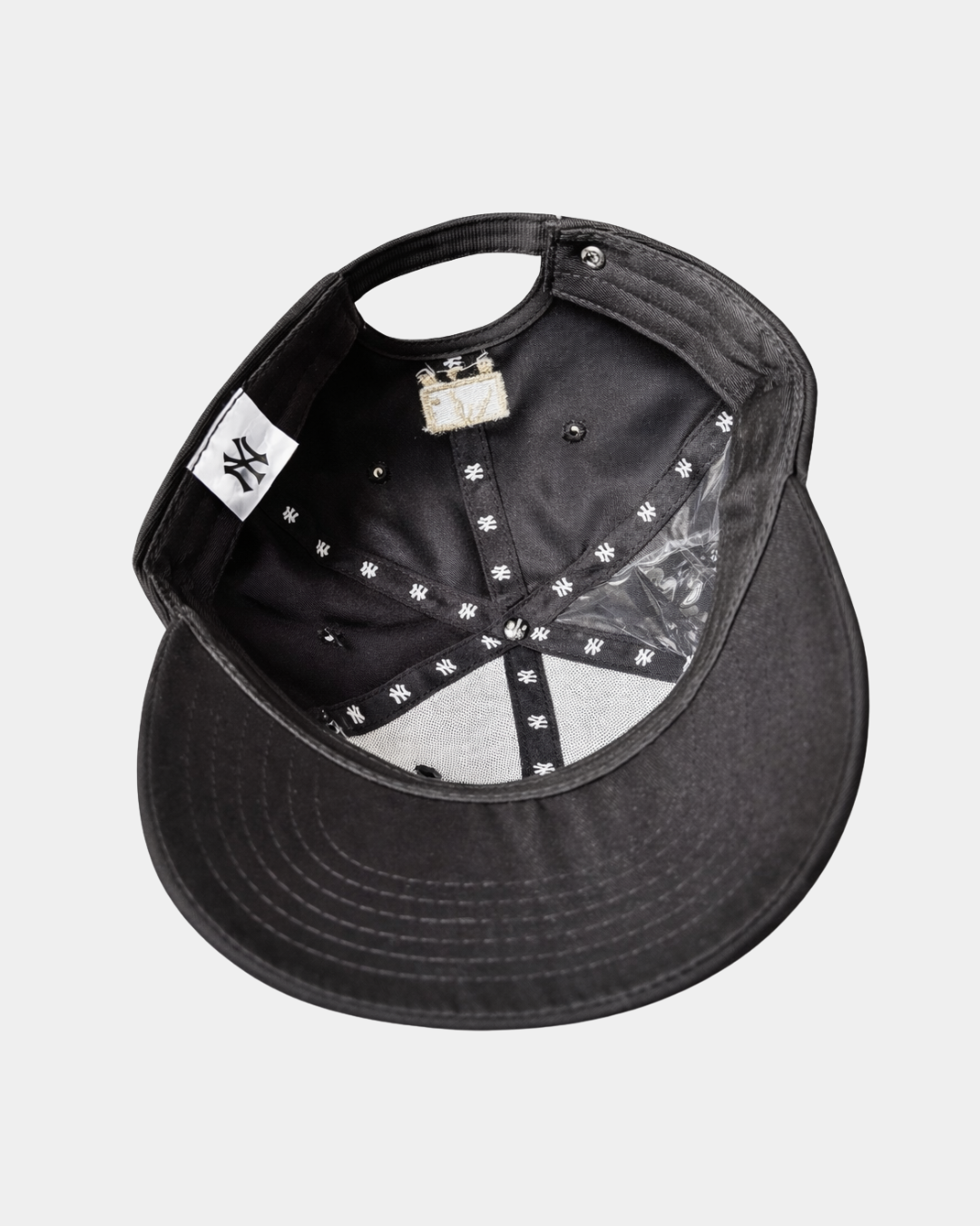 black unisex fit cap with NY-style monogram design and gold embroidered logo. Features a curved brim and adjustable strap for a comfortable unisex fit.