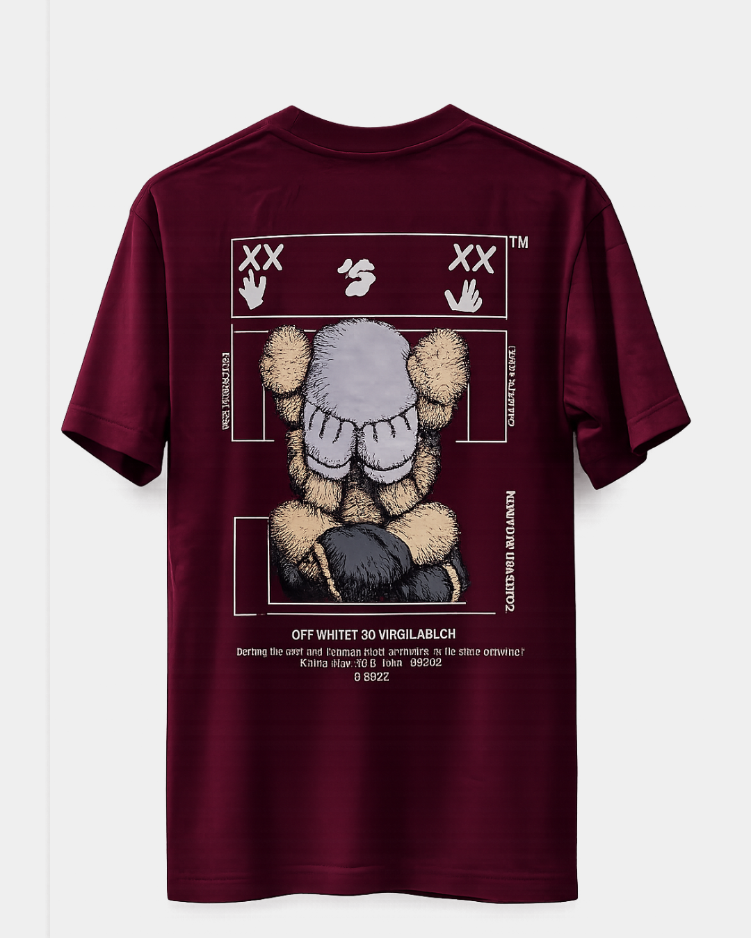 Upgrade your streetwear collection with this burgundy graphic t-shirt featuring a bold KAWS-style character print. Designed with a classic crew neck and comfortable cotton fabric, this tee delivers both style and everyday comfort. The eye-catching front and back artwork adds a unique artistic streetwear vibe, making it perfect for casual outfits, urban fashion, and collectors of graphic tees.