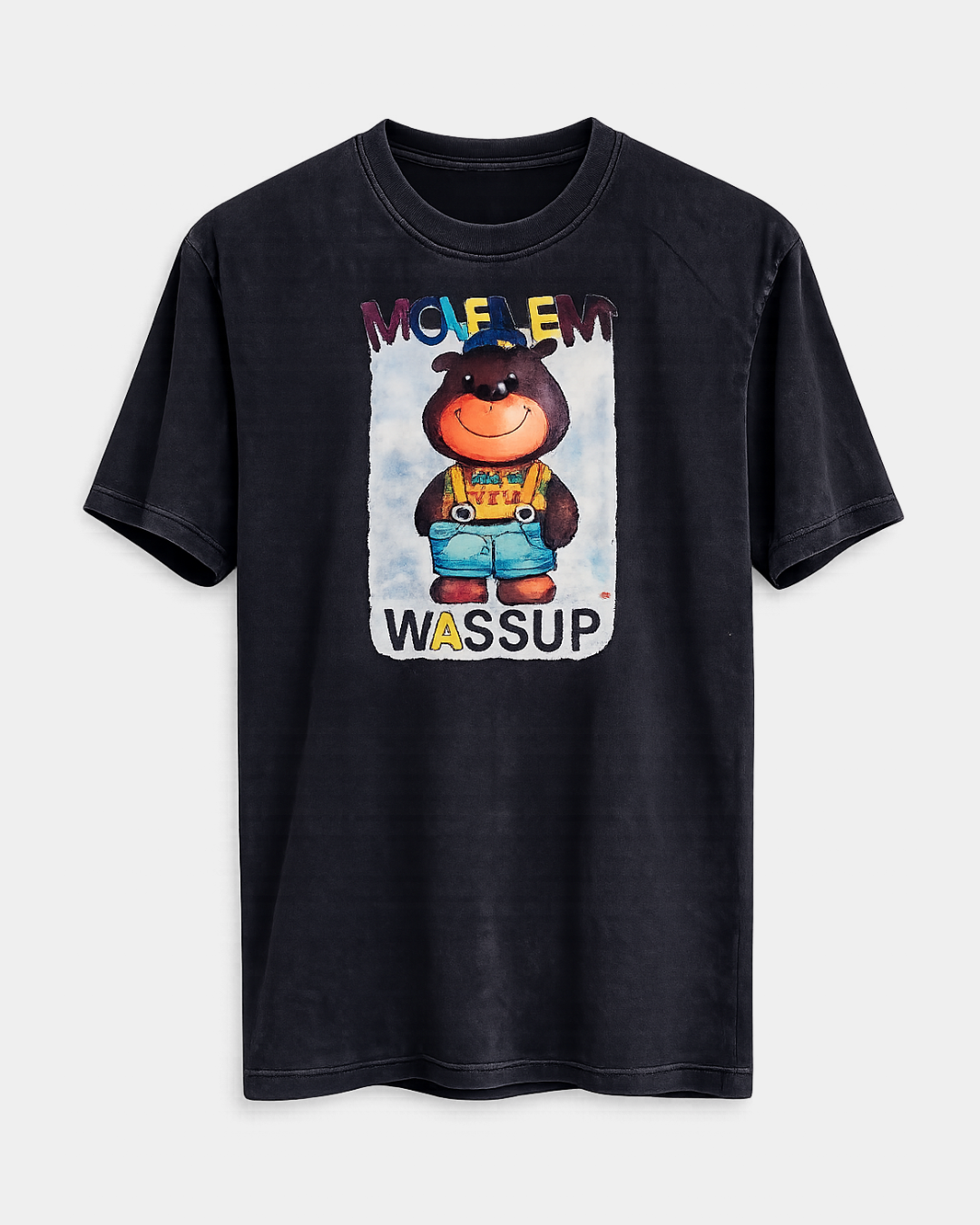 Make a statement with the Movem Wassup Bear Graphic T-Shirt, a standout black streetwear tee designed for effortless style and comfort. Featuring a colorful cartoon bear graphic with bold “Movem Wassup” typography, this piece blends playful design with a modern urban aesthetic.