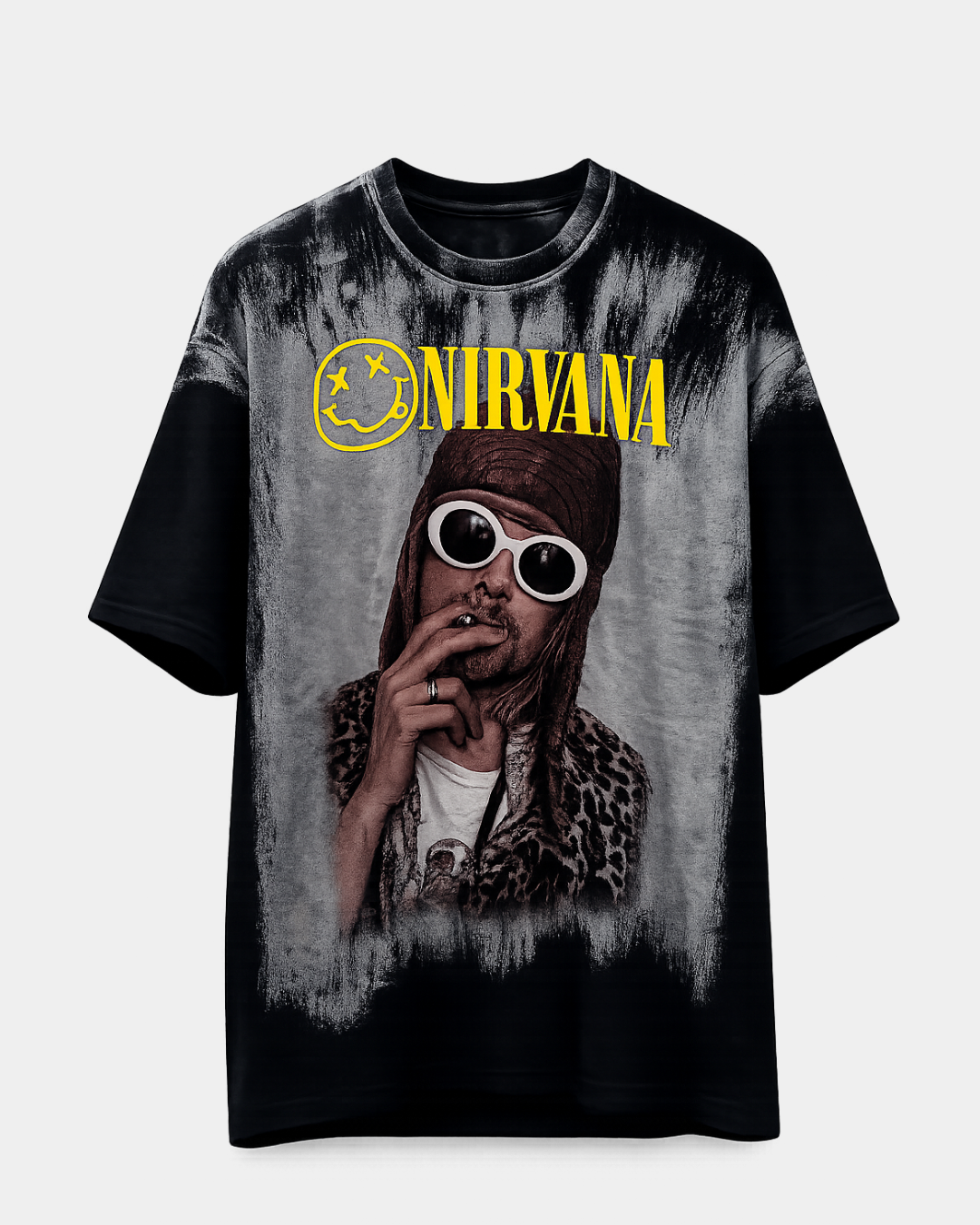 A bold vintage Nirvana oversized tee featuring the iconic yellow smiley logo and Kurt Cobain graphic on the front, paired with a unique distressed brush-stroke pattern on the back. Designed with a relaxed oversized fit for a modern streetwear look.
