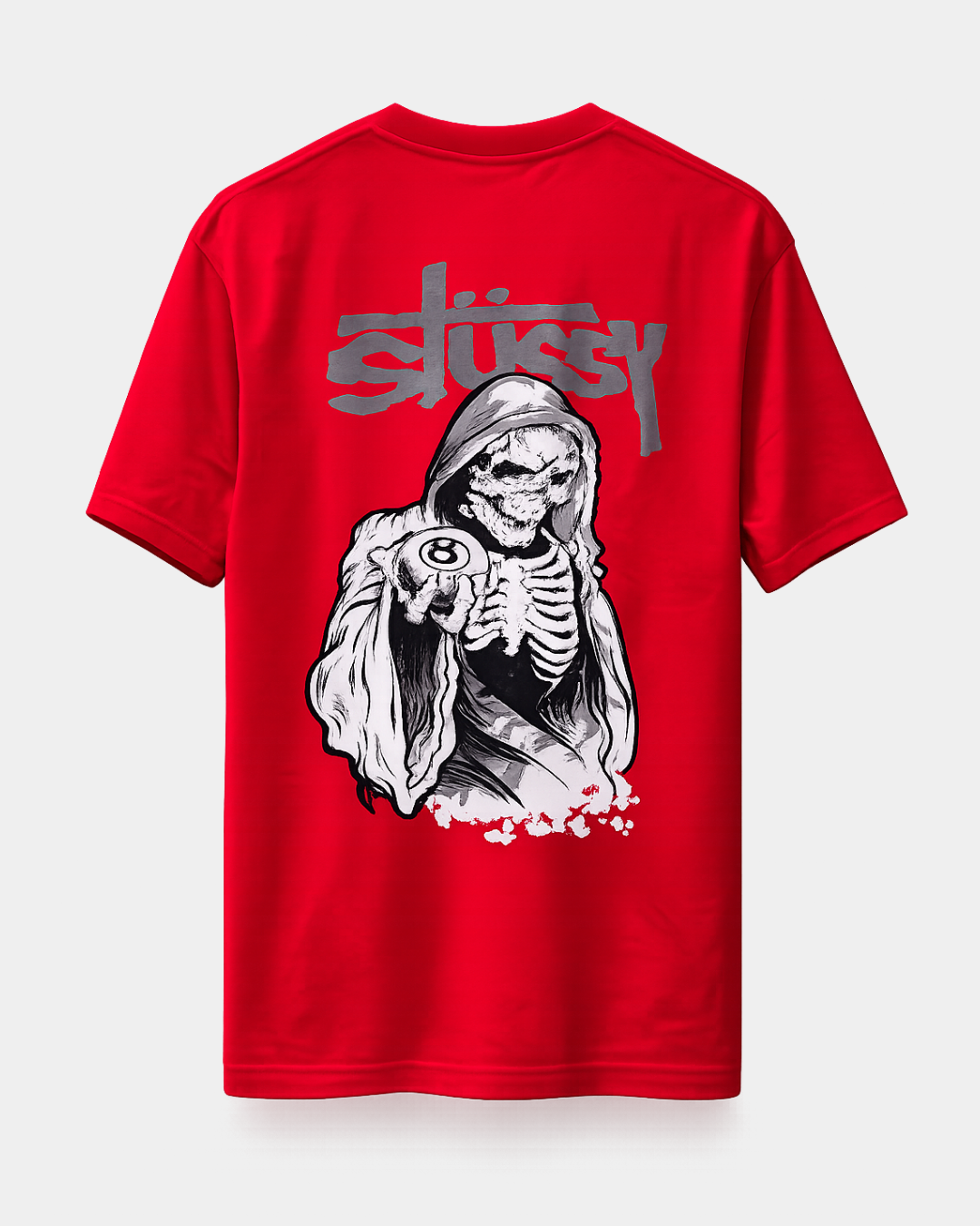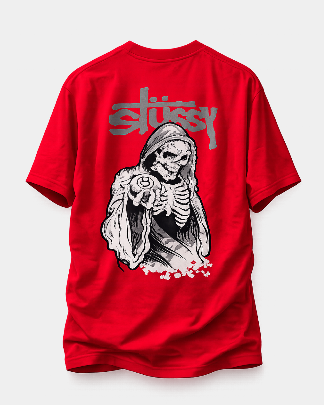 Upgrade your streetwear collection with the Stüssy Grim Reaper 8-Ball Oversized Red T-Shirt, a bold statement piece designed for comfort and style. Crafted in a vibrant red colorway, this tee combines the iconic Stüssy signature logo on the front chest with a powerful Grim Reaper holding an 8-ball graphic on the back, creating a striking visual that embodies classic skate and street culture.