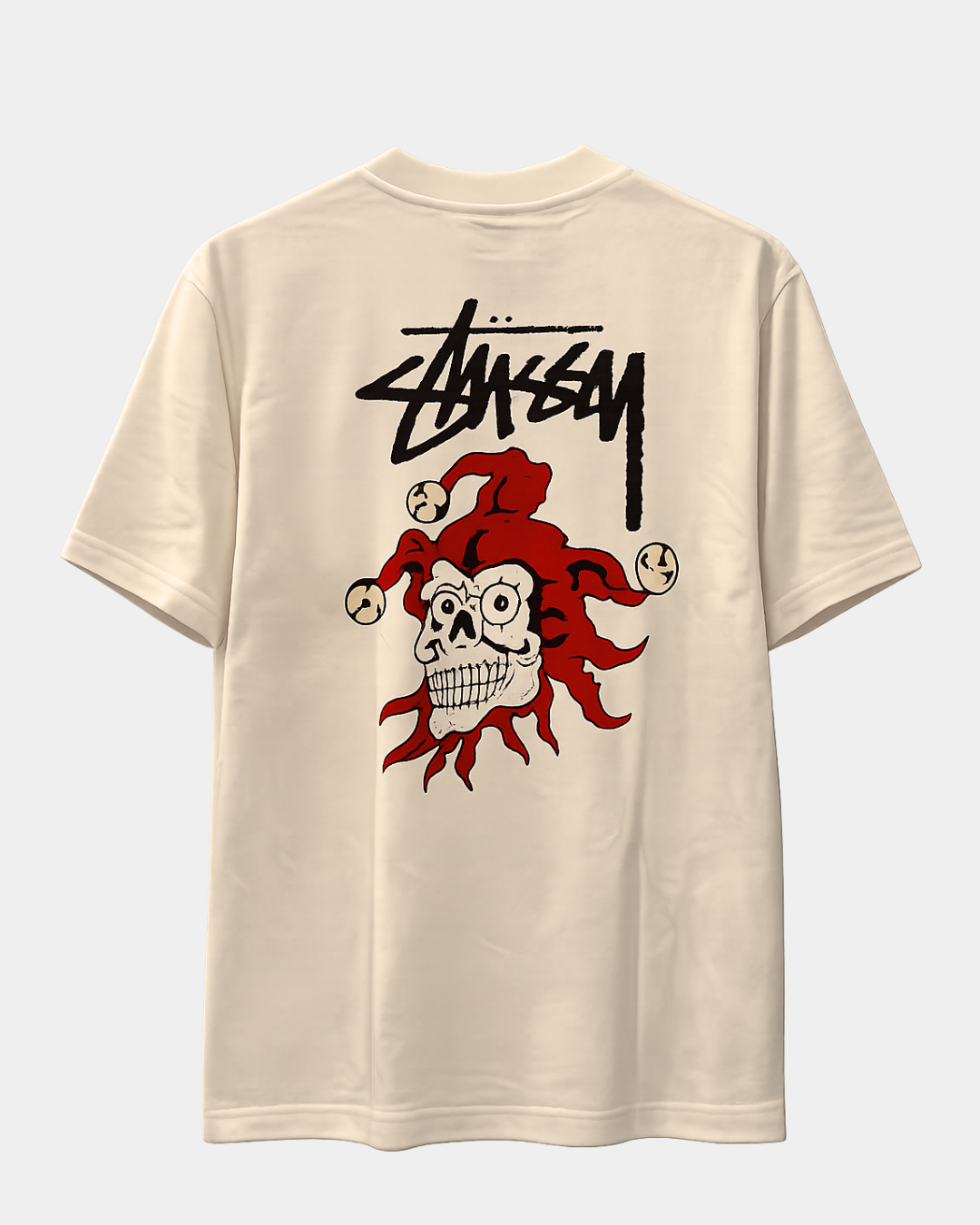 Make a bold streetwear statement with the Stüssy Jester Skull Graphic Oversized T-Shirt in cream. Designed with a minimal front and striking back print, this tee perfectly blends classic Stüssy style with edgy graphic artwork.