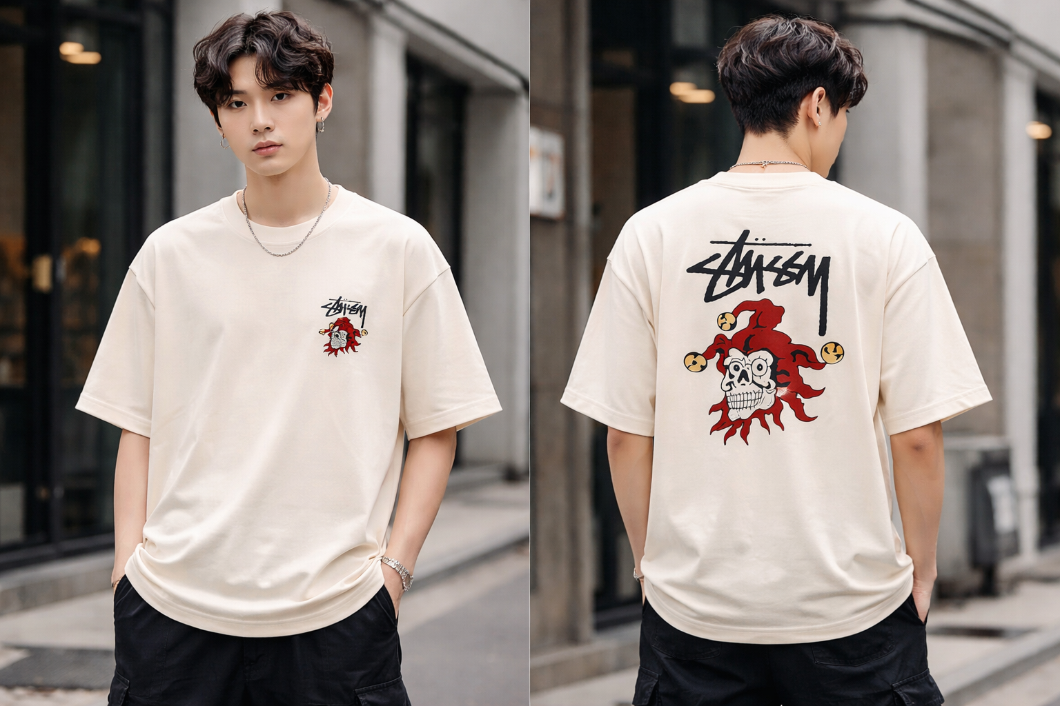 The front features a subtle chest logo with the iconic Stüssy script and jester skull graphic, while the back showcases a large statement print of the jester skull beneath the Stüssy logo, creating a standout look from every angle.