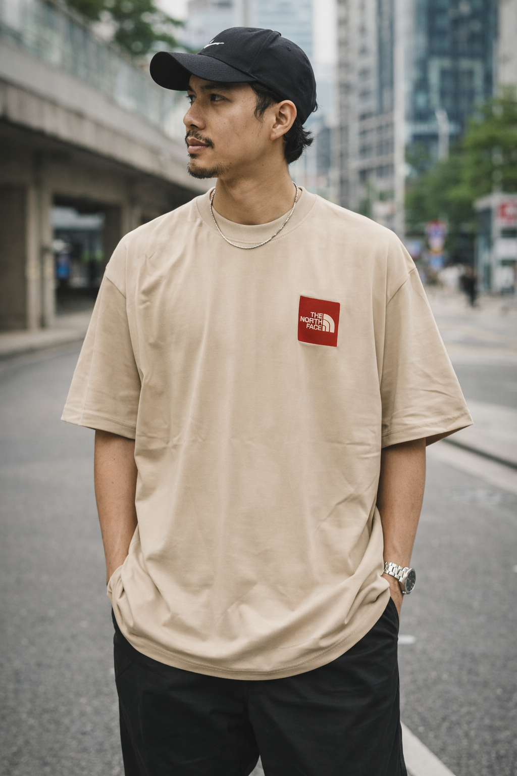 Minimal, clean, and effortlessly stylish. This beige oversized tee features a bold red chest patch and The North Face logo detail, crafted from soft premium cotton for everyday comfort and street-ready appeal.